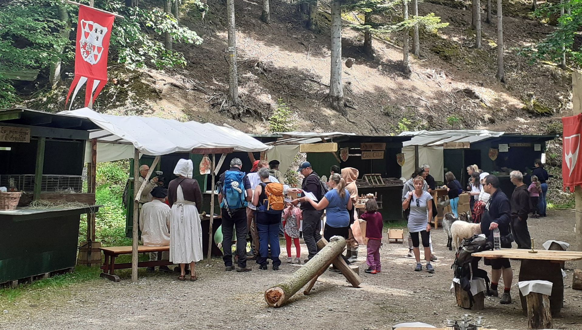 À l’auberge et à la taverne : planchettes, tartes, bières artisanales, jus de pomme, sirops. Porée du mineur le samedi et sanglier cuit à la braise le dimanche !
